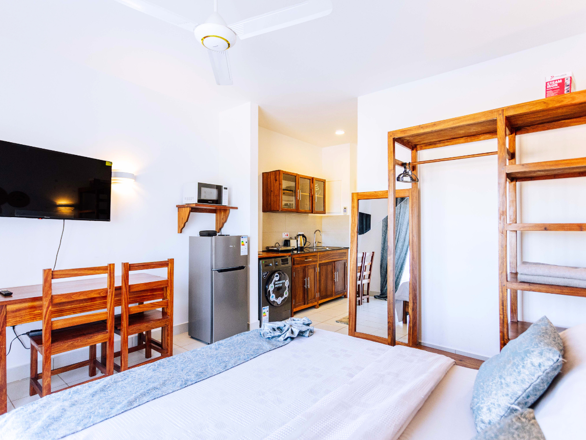 Kick back and relax in this stylish 2nd floor studio apartment in up-and-coming Fumba Town, Zanzibar. This unit is light, bright, and airy, offering functional comfort with stunning community and water views. It is perfectly situated for digital nomads and short-term tourists alike.